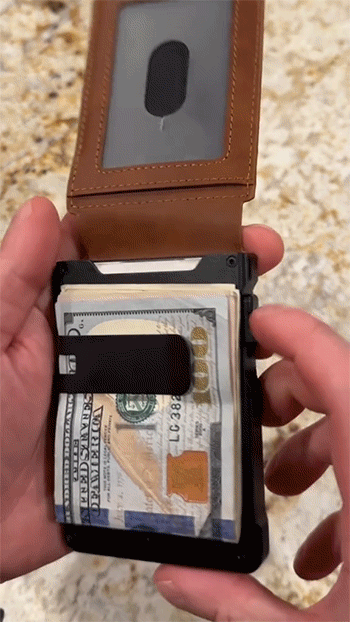 - ćMINIMALIST WALLET ć:Ā We have chosen high quality materials for the wallet cover. Handmade high quality leather + carbon fiber texture.. The aluminum wallet chamber make of premium metal with a smooth eject pop up feature, using the latest ergonomic design, easy slide the side button of the metal wallet and get the neat pop-up cards.